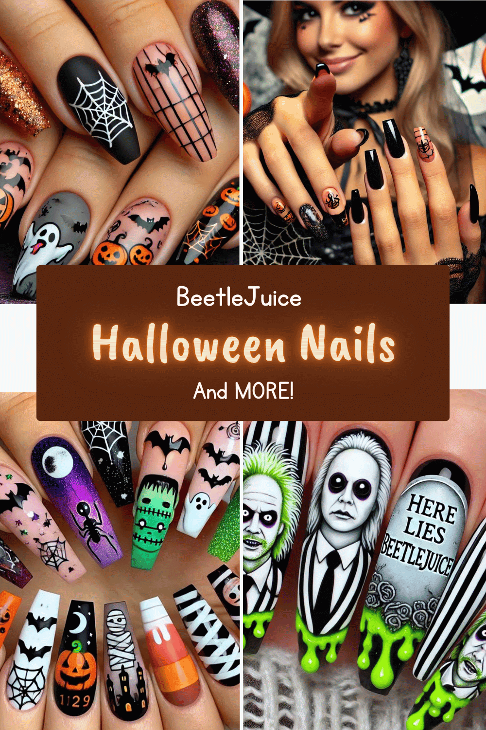 Take your nail game to the next level by spelling out “Beetlejuice” across your nails! Use a mix of neon green, black, and white for a high-contrast design that pops. You could even add little gravestones, skulls, or sandworms to each letter for extra flair. This look is perfect for fans who want their nails to stand out just as much as the film itself!